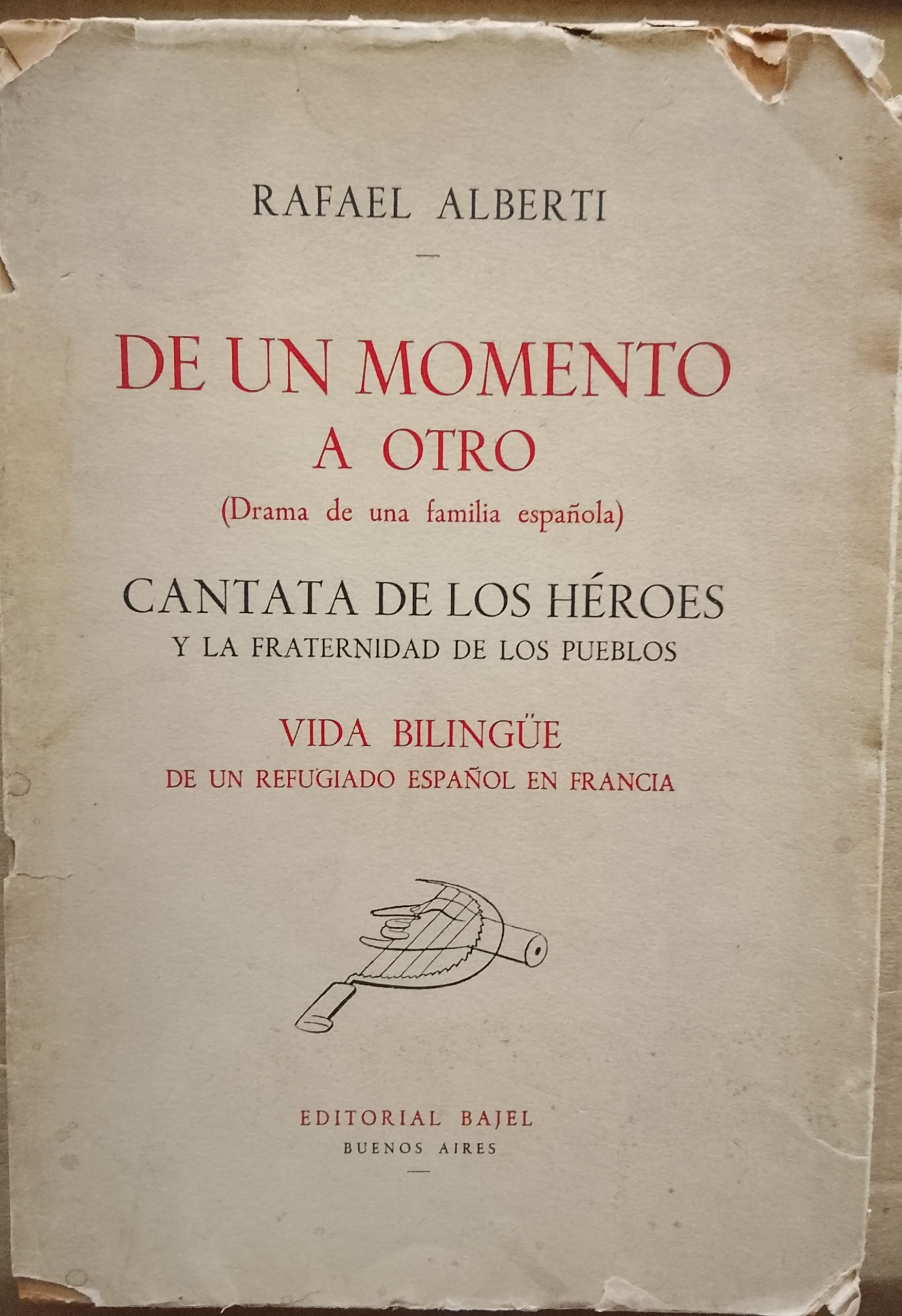 De un momento a otro. Drama de una familia española. Buenos Aires 1942. Editorial Bajel, 232 páginas. Primera edición. Tapa Suelta